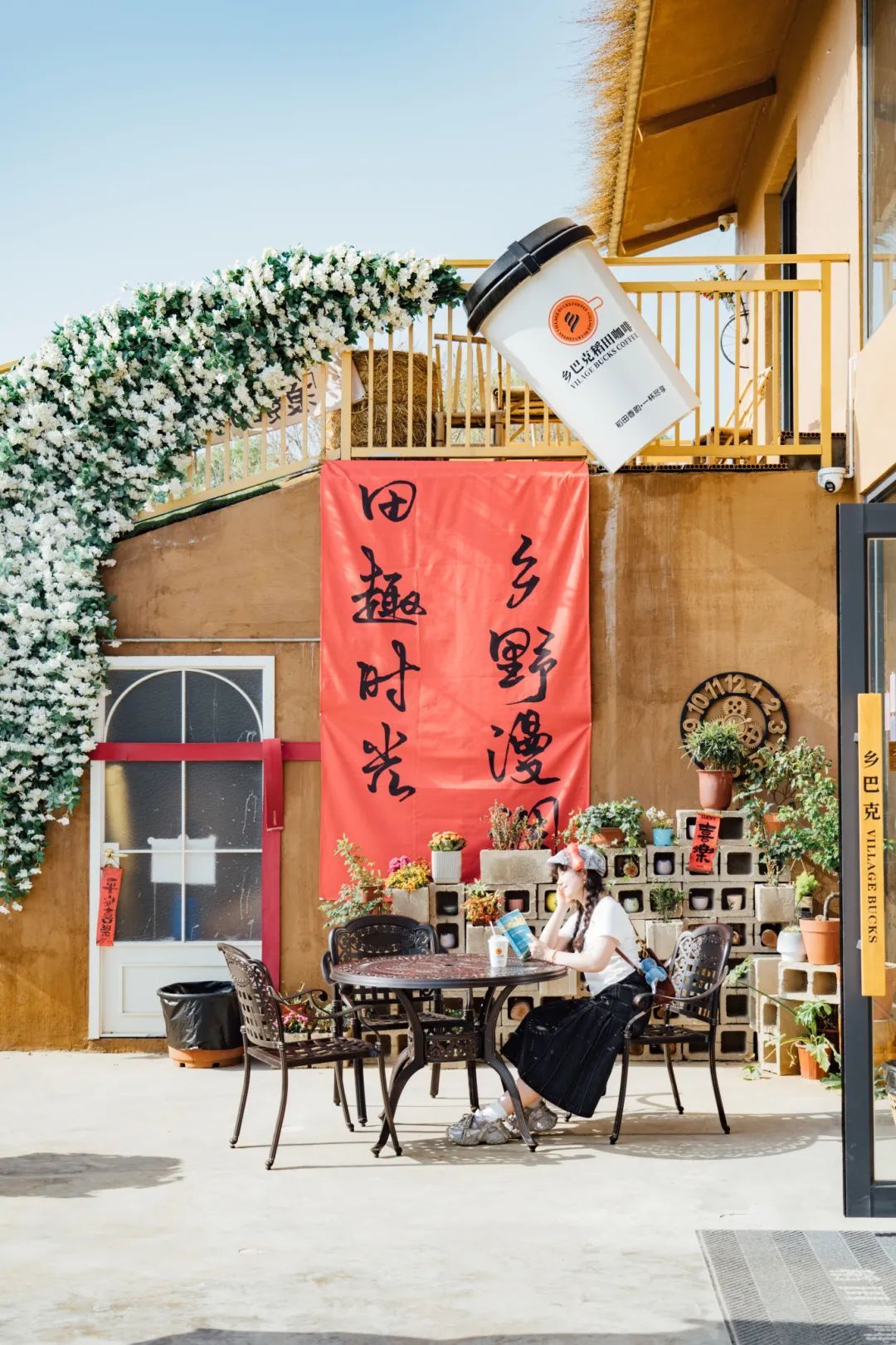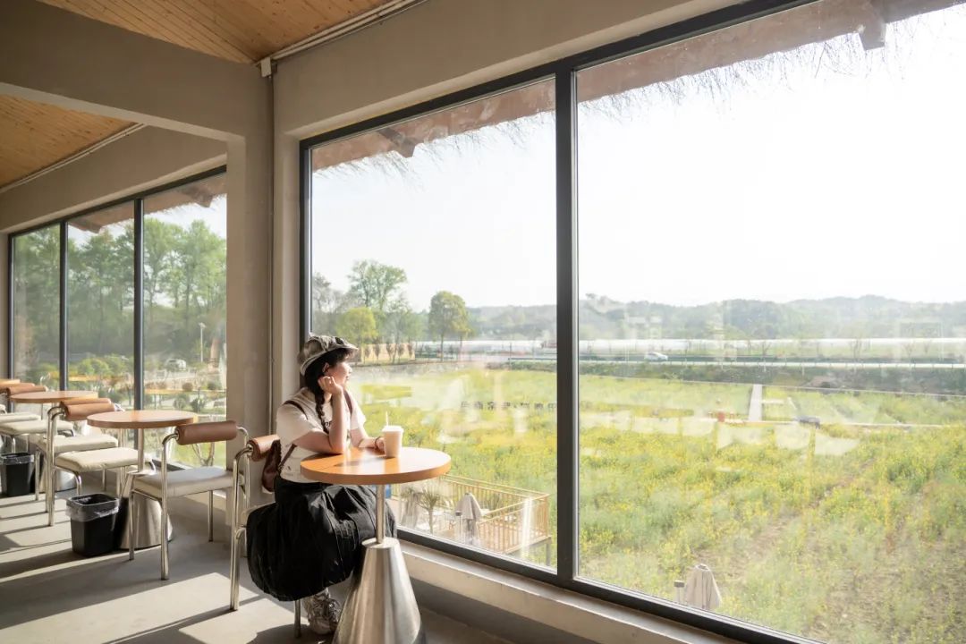靠窗的吧臺也十分吃香,時不時有年輕的女孩端起咖啡,輪番坐上吧臺椅拍照,背景是屋外的稻田與花海,非常“出片”。
