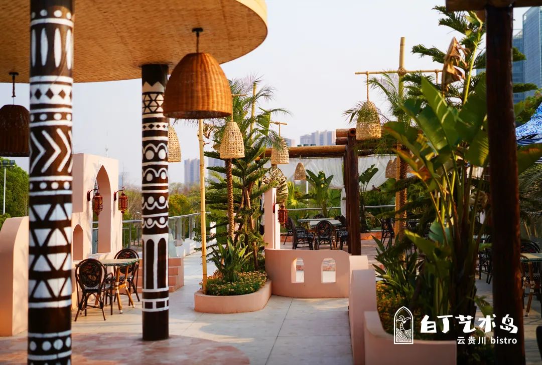 白丁藝術(shù)島坐落于武漢國際體育文化休閑園內(nèi),總占地面積近4000m2。踏進(jìn)這座蘊(yùn)含東南亞風(fēng)情的神秘小島,組合式藝術(shù)空間藏在繁茂的熱帶植物中,近200米長的生態(tài)水系蜿蜒貫穿,法式南洋風(fēng)情藝術(shù)空間群由連廊貫通,筆直的中東海藻、加那利海棗高大挺拔。