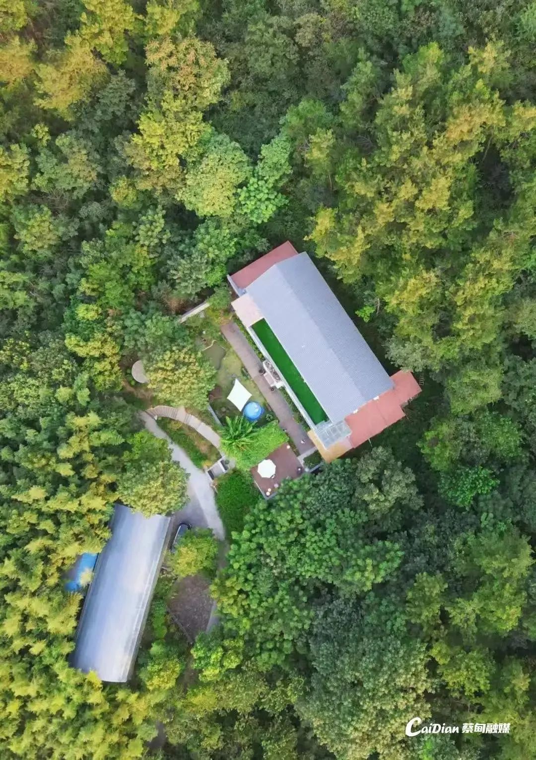 九真山腳下,隱匿在竹海森林之中,私密而小眾。民宿建筑取意“花開有時,知音難覓”——主樓如綻放的夏花般舒展,庭院中蜿蜒的水系暗合“高山流水”的韻律。