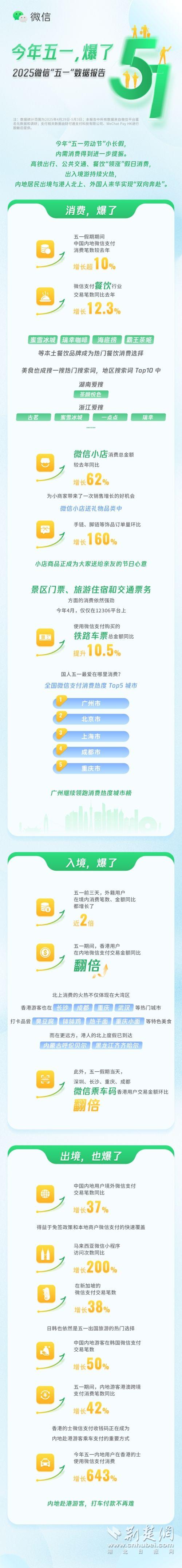 荊楚網(wǎng)(湖北日報網(wǎng))訊(通訊員 袁軒 )今年勞動節(jié)假期首次增加一天,內(nèi)需消費(fèi)得到進(jìn)一步提振。5月5日,微信團(tuán)隊發(fā)布的2025五一數(shù)據(jù)報告顯示,假期微信支付交易筆數(shù)增長超10%,高鐵出行、公共交通、餐飲“領(lǐng)漲”假日消費(fèi),除成都、重慶、杭州外,東莞、蘇州、佛山等城市進(jìn)入全國消費(fèi)熱度Top 10。
