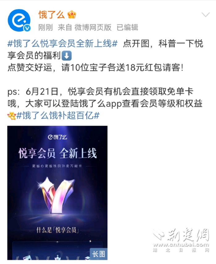 荊楚網(wǎng)(湖北日?qǐng)?bào)網(wǎng))訊(通訊員 易曄)在“外賣大戰(zhàn)”持續(xù)升溫的背景下,餓了么近日繼續(xù)發(fā)力用戶側(cè)體驗(yàn)升級(jí)。6月18日,餓了么官宣已在全國(guó)上線“悅享會(huì)員”,推出多項(xiàng)貼心服務(wù)和專屬權(quán)益,主打讓用戶“用得多省得多”。