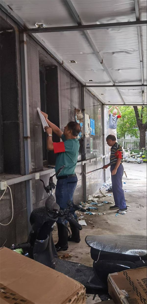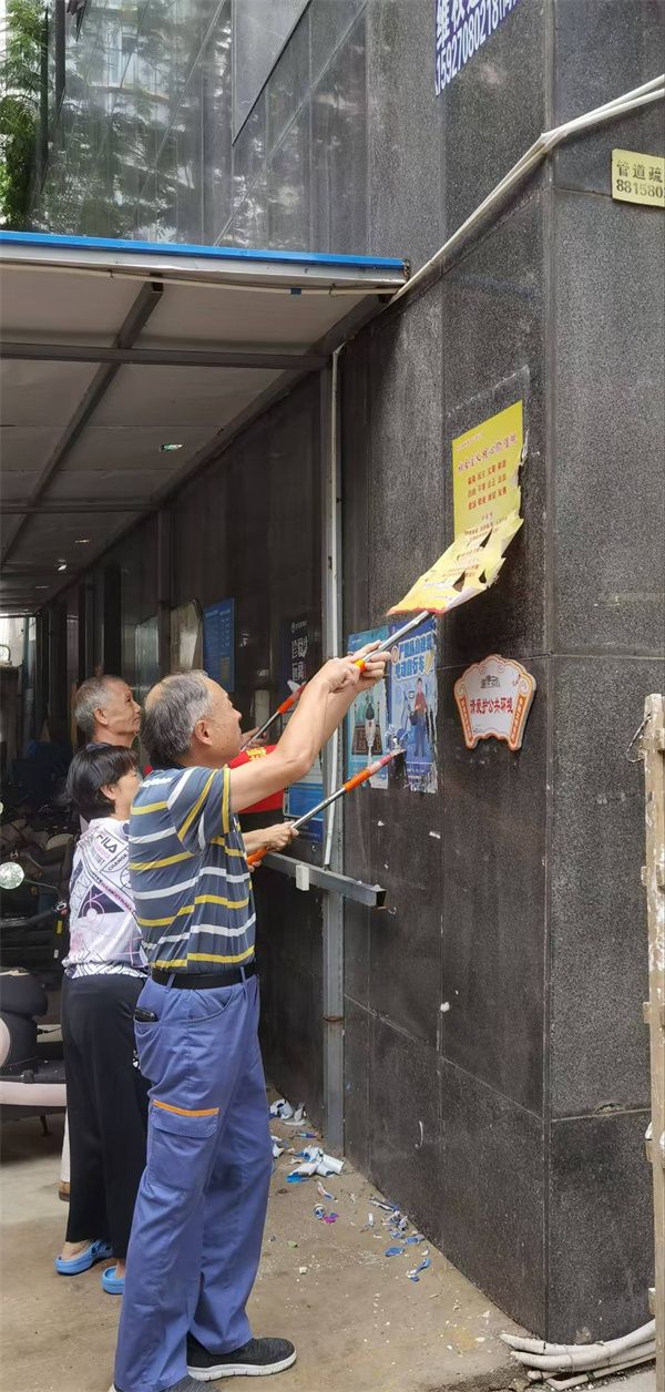 行動中,志愿者們分為兩組,分工協(xié)作、高效推進?!芭Fぐ_”清理組攜帶專業(yè)工具,對小區(qū)各樓棟墻面、單元門、電梯間及公共設(shè)施上的各類小廣告進行徹底清理。面對黏附牢固的廣告貼紙,大家先以噴壺濕潤軟化,再細致鏟除,最后用抹布擦拭干凈,不遺漏任何一處衛(wèi)生死角。