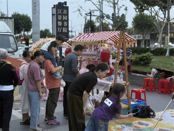 活動(dòng)現(xiàn)場(chǎng)設(shè)置市集區(qū)與演藝區(qū)兩大板塊。市集區(qū)內(nèi)人頭攢動(dòng),轄區(qū)共建單位、音樂企業(yè)與多家商戶積極參與,匯聚特色商品與音樂互動(dòng)體驗(yàn)。大音琴行展出多種樂器并銷售音樂周邊產(chǎn)品,吸引眾多武漢音樂學(xué)院學(xué)生及音樂愛好者駐足交流;元祖食品推出月餅、點(diǎn)心等節(jié)令糕點(diǎn)展銷,為中秋佳節(jié)提前預(yù)熱;艷陽(yáng)天·非遺鮰魚(黃鶴樓店)、中百倉(cāng)儲(chǔ)、九州上醫(yī)館及多家大成路特色美食商戶也紛紛設(shè)點(diǎn),讓市民在觀賞演出之余,盡享購(gòu)物與美食樂趣。