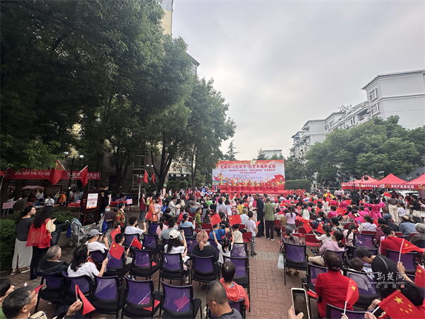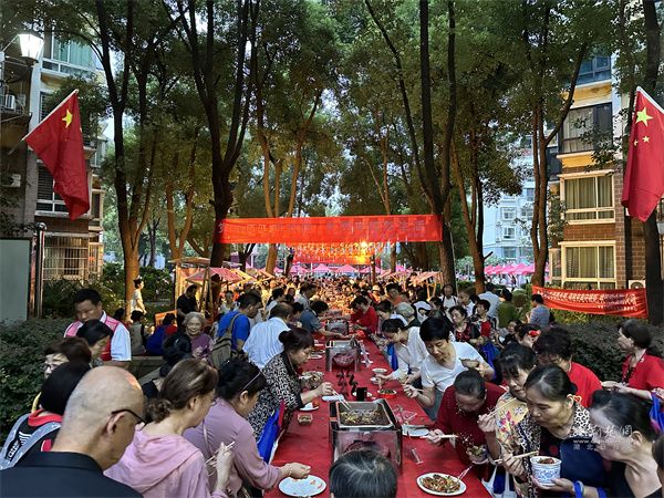 活動(dòng)中,文藝表演與互動(dòng)環(huán)節(jié)穿插進(jìn)行,帥鼓《歌唱祖國》、民樂《地道戰(zhàn)》、黃梅戲《再唱山歌給黨聽》輪番上演。當(dāng)54平方米的巨幅國旗緩緩展開,居民們揮舞小國旗齊唱贊歌,手中的紙飛機(jī)帶著美好祝愿飛向夜空,電子煙花綻放的瞬間,現(xiàn)場氣氛達(dá)到高潮。此外,三輪抽獎(jiǎng)、“最受歡迎菜品”評選等環(huán)節(jié),更讓活動(dòng)充滿驚喜與趣味。
