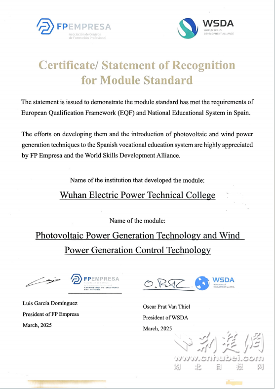 荊楚網(wǎng)(湖北日?qǐng)?bào)網(wǎng))訊(通訊員 陳書雨)當(dāng)前全球能源結(jié)構(gòu)加速向可再生能源轉(zhuǎn)型,跨國(guó)技術(shù)協(xié)作與職業(yè)教育標(biāo)準(zhǔn)互通,已成為推動(dòng)能源產(chǎn)業(yè)高質(zhì)量發(fā)展的關(guān)鍵紐帶。9月26日,國(guó)網(wǎng)湖北技培中心(武漢電院)(以下簡(jiǎn)稱“技培(電院)”)“西班牙國(guó)家課程標(biāo)準(zhǔn)及數(shù)字化課程開(kāi)發(fā)項(xiàng)目”關(guān)鍵節(jié)點(diǎn)落地,成功完成《光伏發(fā)電技術(shù)》《風(fēng)力發(fā)電控制技術(shù)》兩門課程跨國(guó)培訓(xùn)直播,這一里程碑事件標(biāo)志著技培(電院)自主研發(fā)的兩門課程標(biāo)準(zhǔn)正式輸出西班牙,為中西能源職教合作搭建起全新橋梁。