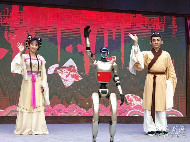 荊楚網(wǎng)(湖北日報網(wǎng))訊(通訊員王晶、費留燦)國慶中秋假期,在黃梅縣東山問梅村,當(dāng)黃梅戲《女駙馬》的經(jīng)典唱段響起,機(jī)器人踩著婉轉(zhuǎn)唱腔靈活擺臂、轉(zhuǎn)身,復(fù)刻戲曲身段的韻味;戲腔未落,身著傳統(tǒng)獅頭裝扮的機(jī)器狗躍至臺前,跟著鼓點騰躍撲閃,鬃毛翻飛間盡顯靈動,引得游客紛紛舉手機(jī)拍攝,鏡頭緊追這些“特殊演員”。