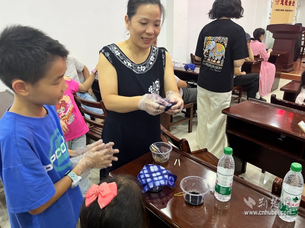 在動手體驗環(huán)節(jié),孩子們興致勃勃地嘗試各種扎結方法,家長們在旁細心協(xié)助。經過精心捆扎與浸染,當一塊塊布料被緩緩展開,呈現(xiàn)出獨一無二的藍白紋樣時,現(xiàn)場響起陣陣驚嘆?;顒硬粌H提升了孩子們的動手能力與專注力,更讓他們深切感受到傳統(tǒng)技藝的魅力與勞動的喜悅。