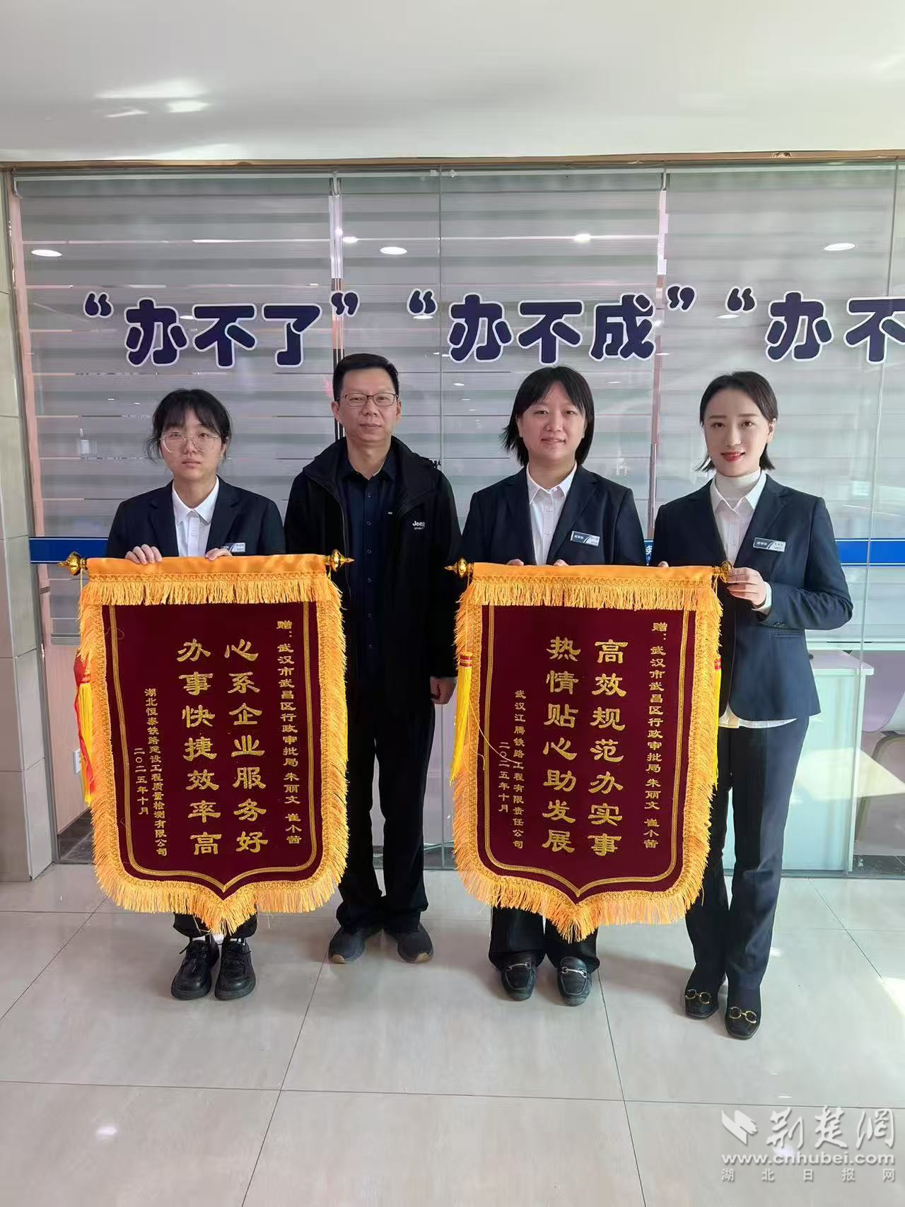 荊楚網(湖北日報網)訊(記者 李燕 通訊員 李永波 王金丹)10月24日,中國鐵路武漢局集團旗下湖北恒泰鐵路建設工程質量檢測有限公司、武漢江騰鐵路工程有限責任公司,順利辦結業(yè)務變更手續(xù)后,經辦人董先生專程送來2面錦旗,向武昌區(qū)行政審批局工作人員表達謝意。