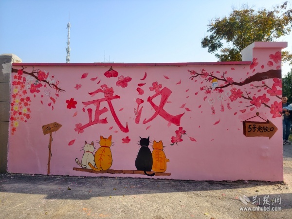 次日,創(chuàng)作進入精修階段。志愿者們細致調整“武漢”字樣的色彩飽和度,用粉白顏料層層暈染出飛揚的櫻花花瓣。四只形態(tài)各異的貓咪相依蹲坐,靈動可愛;特意添加的“5號地鐵口”指引牌等實用元素,更讓作品兼具藝術性與功能性。創(chuàng)作過程中,不斷有居民和游客駐足觀賞,主動詢問設計理念。“我們想通過櫻花、貓咪等元素,展現武漢的浪漫與煙火氣?!敝驹刚咭贿呎{色一邊向圍觀群眾講解。