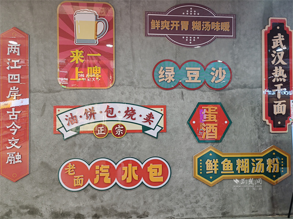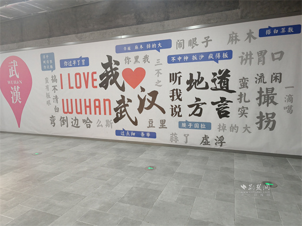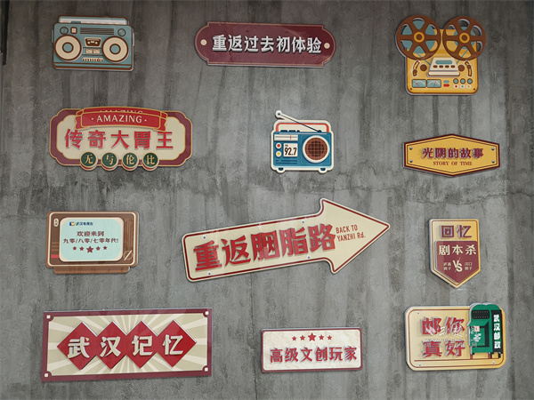 在武商超市胭脂路店前,那面“方言文化墻”便是最生動(dòng)的注解。墻面中央,“我愛武漢”的大字旁,是“零醒、麻木、掉的大”“鬧眼子”“蠻扎實(shí)”等一串地道漢味俚語(yǔ),保留了本土語(yǔ)言那股子鮮活、野性而直接的“脾氣”。側(cè)面墻上點(diǎn)綴的復(fù)古收音機(jī)、老式相機(jī)裝飾牌,與“重返胭脂路”、“武漢記憶”的標(biāo)識(shí),共同構(gòu)成了一扇通往舊日時(shí)光的“穿梭門”。