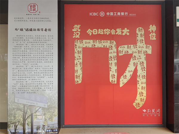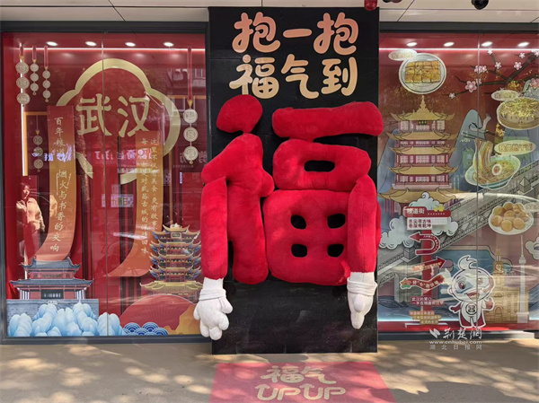 在工商銀行糧道街支行的墻面上,一個(gè)用紅色毛絨打造的巨型“福”字裝置,正伸出憨態(tài)可掬的“手臂”,熱情地向路人發(fā)出邀請(qǐng)——“抱一抱,福氣到”。配合地面“福氣UPUP”的躍動(dòng)光影,冰冷的建筑立面被瞬間激活,化為一個(gè)充滿人情味與互動(dòng)感的“福氣地標(biāo)”,吸引人們駐足擁抱、合影留念。就在一旁,一幅色彩斑斕的“武漢美食地圖”櫥窗徐徐展開,黃鶴樓的巍峨與熱干面、豆皮的市井風(fēng)味奇妙同框,卡通的吉祥物熱情招手,將“舌尖尋古味,巷深有乾坤”的故事,直觀地講述給每一位行人。