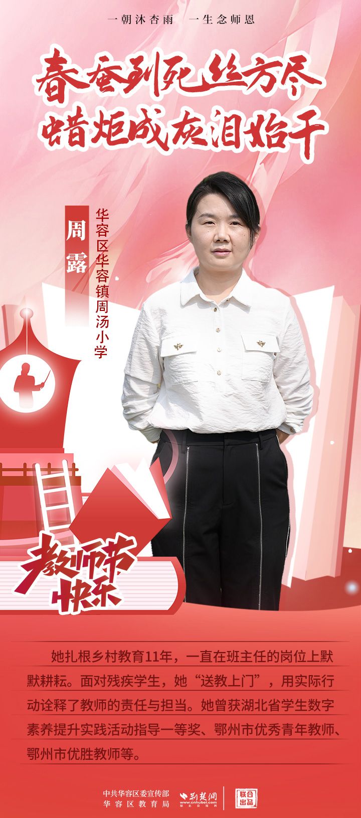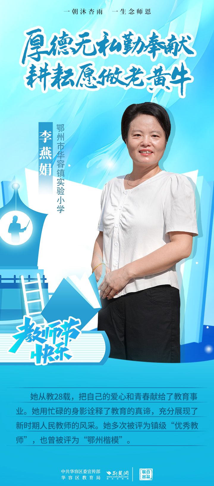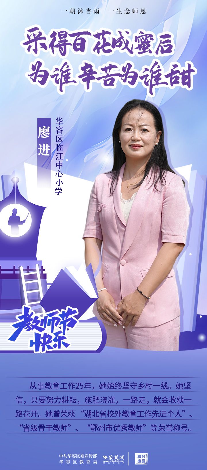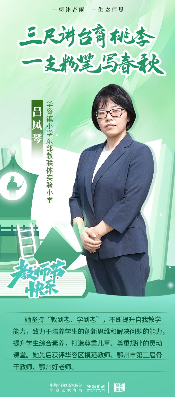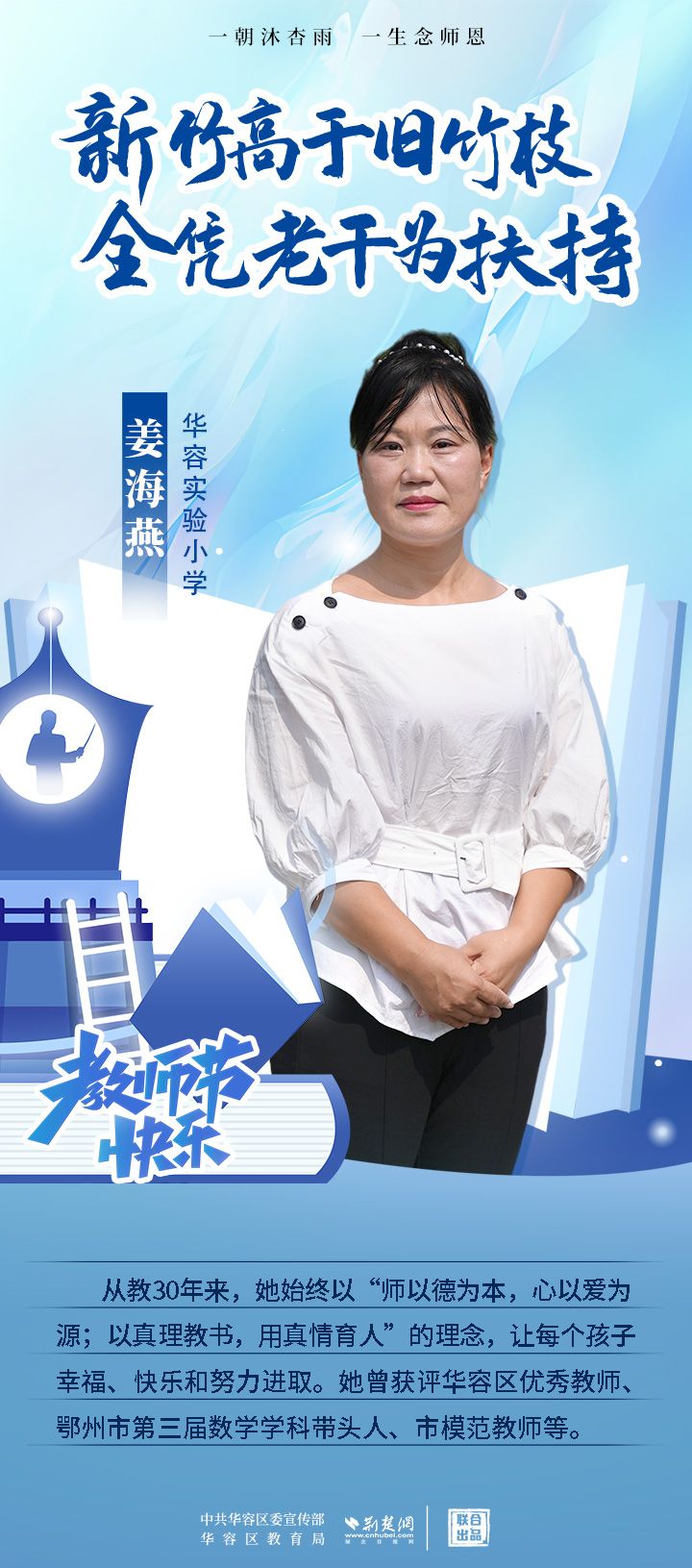 荊楚網(wǎng)(湖北日報網(wǎng))訊(記者 劉璐 通訊員 張曉琴)百年大計,教育為本;教育大計,教師為本。在教師節(jié)來臨之際,中共華容區(qū)委宣傳部聯(lián)合荊楚網(wǎng)(湖北日報網(wǎng))推出創(chuàng)意海報,姜海燕、廖進(jìn)等6名老師入選“荊楚好老師”群星計劃。她們?彰顯了新時代教師的風(fēng)采,?為教育事業(yè)的發(fā)展貢獻(xiàn)了重要力量?,向了不起的她們致敬!