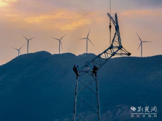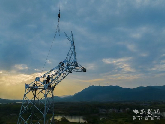 荊楚網(wǎng)(湖北日報網(wǎng))訊(通訊員曹祥魁 袁勝)8月23日下午5點,黃石陽新縣陶港鎮(zhèn)祠堂畈附近,40多米高鐵塔上4名電力工人渾身濕透,他們扶著頭頂上吊車吊過來的鐵部件,開始了最后“一吊”的組塔工作。