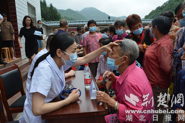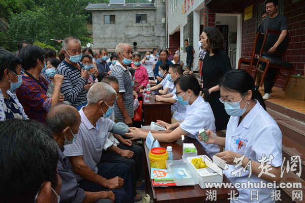 楊柳村位于位于鄖陽區(qū)西南部的大山深處,距離十堰市區(qū)50余公里,是十堰市稅務(wù)局鄉(xiāng)村振興聯(lián)系點(diǎn),村里以老年人居多。聽說市人民醫(yī)院的專家要來義診,村民們?cè)缭缇蛠淼酱逦瘯?huì),在市稅務(wù)局駐村工作隊(duì)的精心組織下,佩戴口罩排起了長隊(duì)。簡短的介紹儀式結(jié)束后,來自市人民醫(yī)院心血管內(nèi)科、兒科、消化內(nèi)科、睡眠醫(yī)學(xué)科、內(nèi)分泌科等專業(yè)學(xué)科的8位專家便立即開始為村民診療。