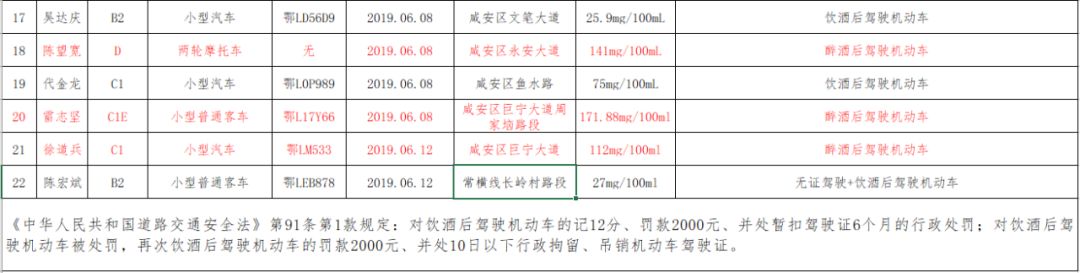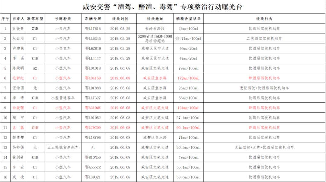 咸安公安分局交警大隊(duì)對酒駕醉駕持續(xù)保持高壓嚴(yán)管“零容忍”態(tài)勢,同時(shí)對近半個(gè)月(5月29日——6月13日)以來的酒駕醉駕駕駛?cè)诉M(jìn)行實(shí)名曝光。