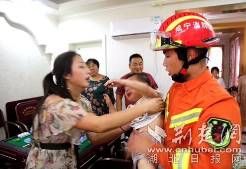 圖為消防員救出小孩現(xiàn)場(chǎng)?!≈鞚龜z