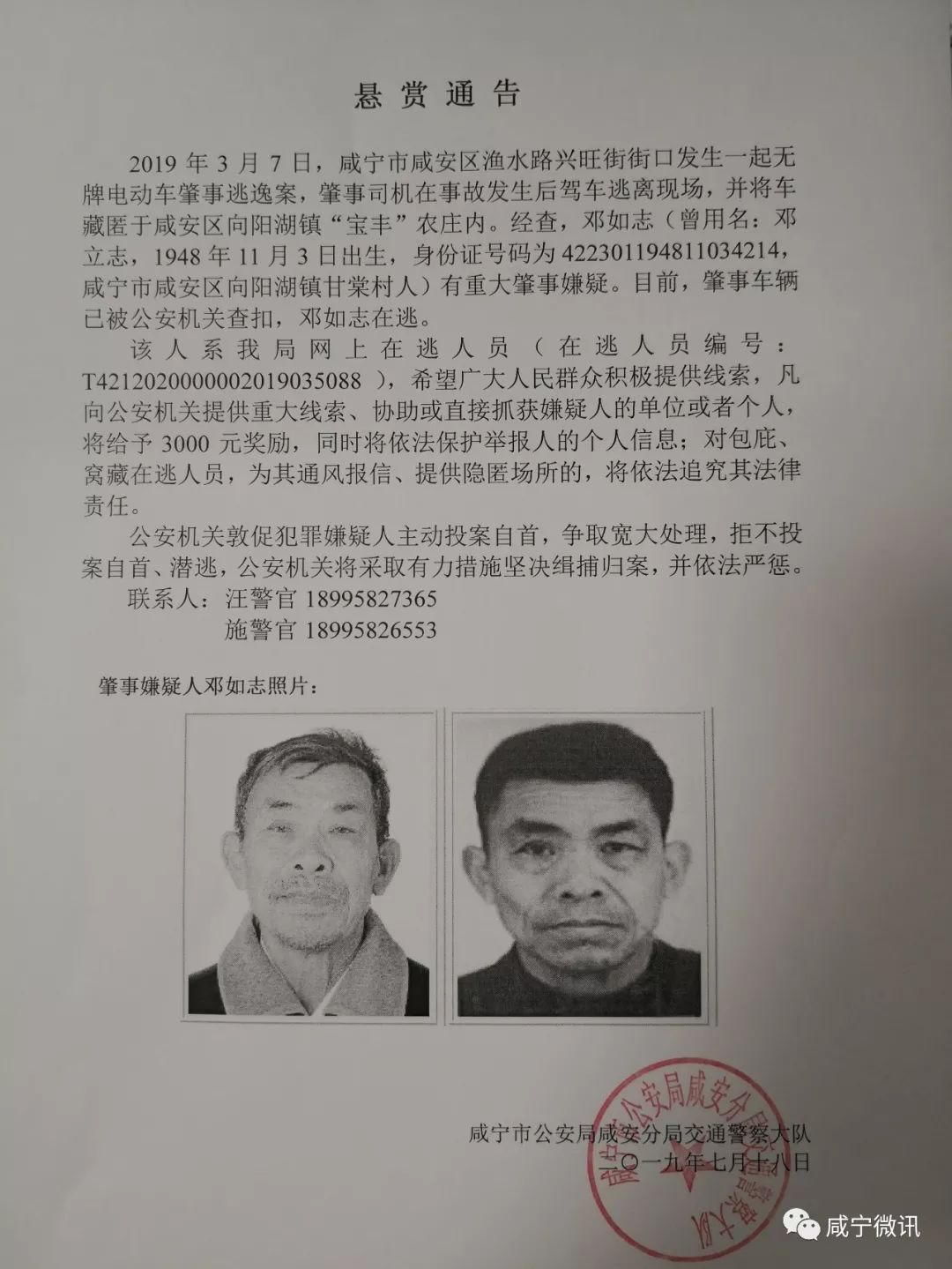 2019年3月7日,咸寧市咸安區(qū)漁水路興旺街街口發(fā)生一起無牌電動車肇事逃逸案,肇事司機在事故發(fā)生后駕車逃離現(xiàn)場,并將車藏匿于咸安區(qū)向陽湖鎮(zhèn)“寶豐”農莊內。經查,鄧如志(曾用名:鄧立志,1948年11月3日出生,身份證號碼為422301194811034214,咸寧市咸安區(qū)向陽湖鎮(zhèn)甘棠村人)有重大肇事嫌疑。目前,肇事車輛已被公安機關查扣,鄧如志在逃。