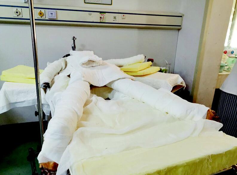 7月5日,武漢第三醫(yī)院燒傷病區(qū)。10歲的小女孩婷婷(化名),身體纏滿紗布趴在病床上,見(jiàn)有陌生人走來(lái),立即垂下了頭。