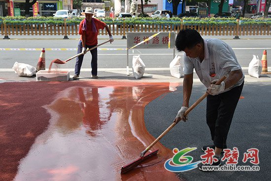 赤壁網(wǎng)消息(記者 聶愛(ài)陽(yáng))先往地面倒上攪拌均勻的膠粘劑,用推水器推平;再往上撒上陶瓷顆粒,用鐵鏟抹勻。頃刻間,一條嶄新的紅色防滑車道就這樣鋪就而成。8月6日,在赤壁市沿河大道,工人們正在緊張鋪設(shè)紅色防滑車道。