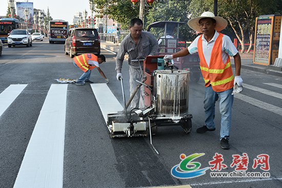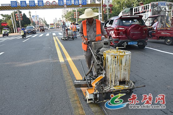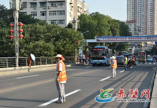 赤壁網消息(記者 聶愛陽)8月6日,記者在一橋路段看到,工人們正在對路面老舊交通標線進行重新噴涂工作。