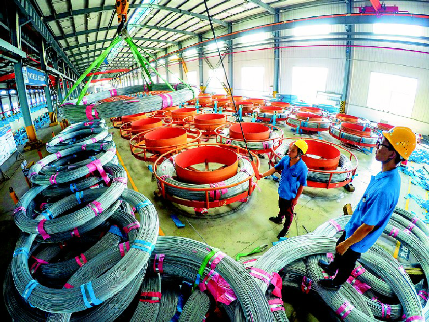 圖為:在嘉魚縣經(jīng)濟開發(fā)區(qū)官橋工業(yè)園內(nèi),湖北歐維姆纜索制品有限公司員工在加工大橋主纜索股。(湖北日報全媒記者 陳勇 通訊員 張育明 攝)