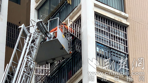 消防員坐云梯車(chē)深入室內(nèi)救援。 (通訊員 肖幫治 攝)