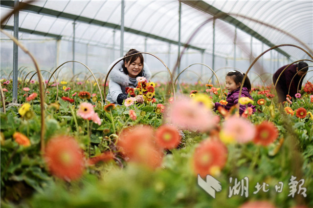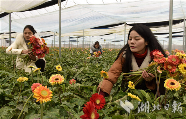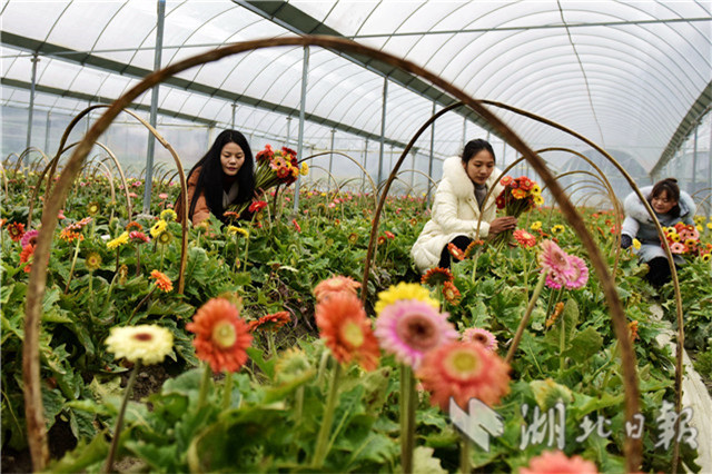 2月20日,湖北省通城縣石南鎮(zhèn)賽公村非洲菊種植專(zhuān)業(yè)合作社社員在采摘非洲菊供應(yīng)市場(chǎng)。