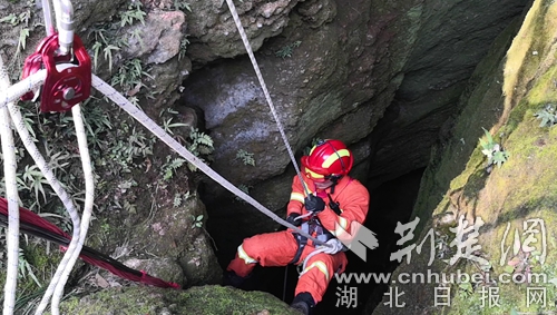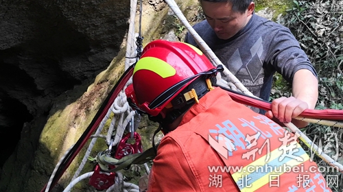 因消防車無法抵達(dá),消防員帶上救援工具,徒步半個(gè)多小時(shí)迅速趕赴事發(fā)現(xiàn)場開展救援。到達(dá)現(xiàn)場后,發(fā)現(xiàn)一名三十多歲男性在一個(gè)10多米的深洞內(nèi)呼救。經(jīng)與被困者和現(xiàn)場群眾溝通了解,此洞名為藏龍洞,是一個(gè)未經(jīng)商業(yè)開發(fā)的深洞,有著悠久的歷史傳說,引來無數(shù)探險(xiǎn)者,這名男子也是因?yàn)楹闷妫露春篌w力不支無法再攀爬出洞被困洞底。中隊(duì)指揮員根據(jù)現(xiàn)場情況,立即利用救援繩索做好安全支點(diǎn),消防員何聰點(diǎn)降至洞底查看被困者情況,所幸洞內(nèi)空氣流暢,被困者無二次受傷的危險(xiǎn),消防員利用隨身攜帶的全身吊帶將被困者固定好后,經(jīng)洞外消防員齊力,最終經(jīng)過20多分鐘的救援,被困人員被成功營救出山洞。