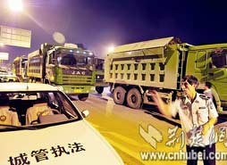市城管局組織對(duì)大型渣土車夜查行動(dòng),被攔停的10輛渣土車中,清一色的車尾不掛牌,橫沖直撞。