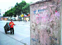 在卓刀泉南路虎泉夜市附近看到,各種廣告“牛皮癬”布滿了像變電箱這樣的公共設(shè)施。