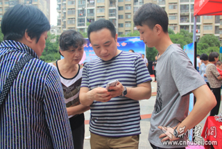 工作人員協(xié)助居民訂閱湖北手機報